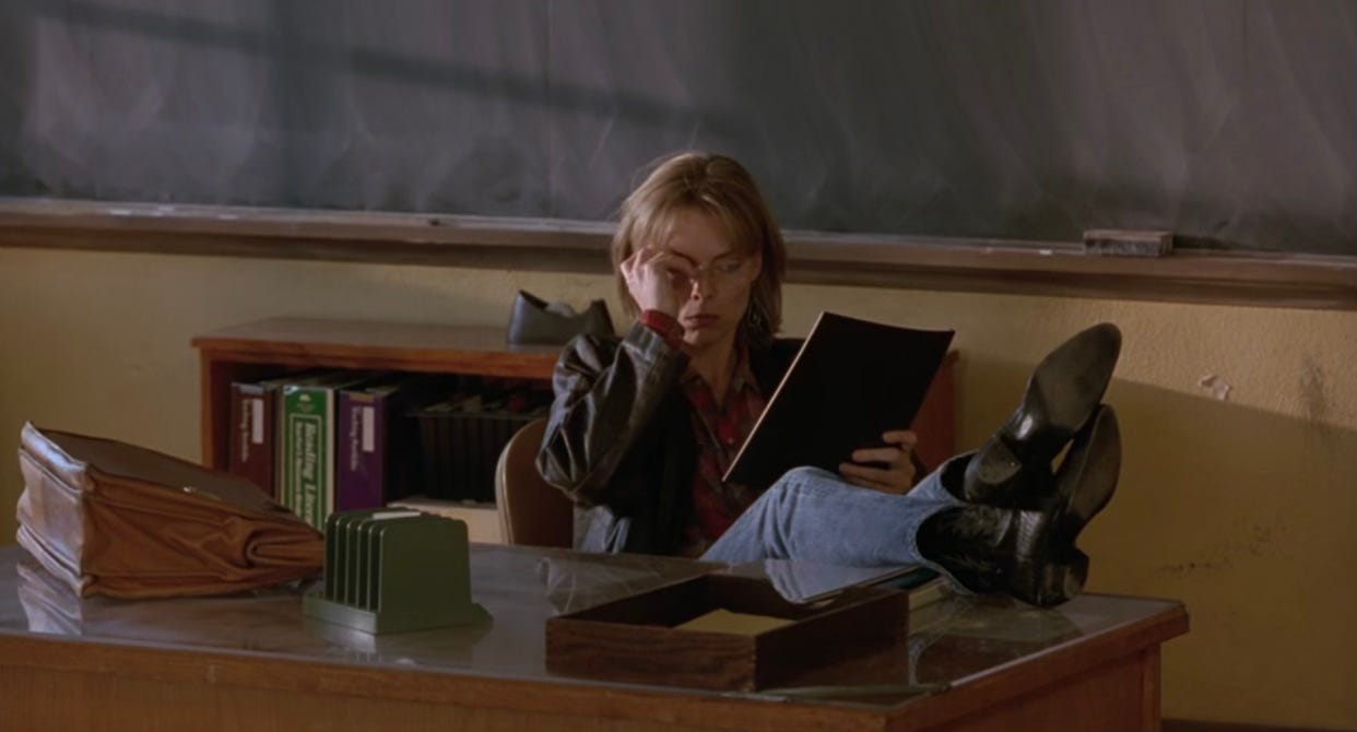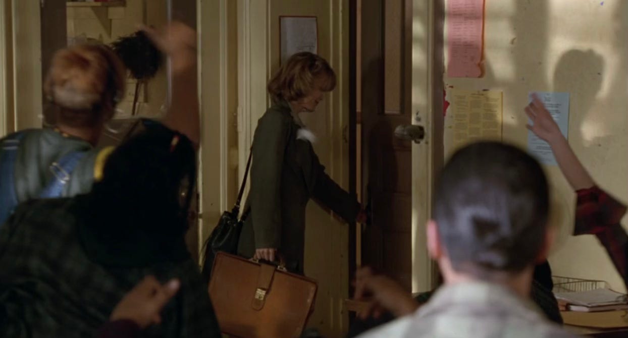 4:58: When Miss Johnson interviews for the new role, her interviewer informs her that the position pays $24,700 per year. I remember rewatching this movie after I became a teacher in 2006 and being like, “They’re only paying her “$24,700!? That’s fucking crazy. I would have never taken that job.” But I just right now ran the numbers through one of those money inflation calculator things, and it turns out that what I was getting paid my first year as a teacher ($41,000) shakes out to about $300 less than what she was being paid, lol.