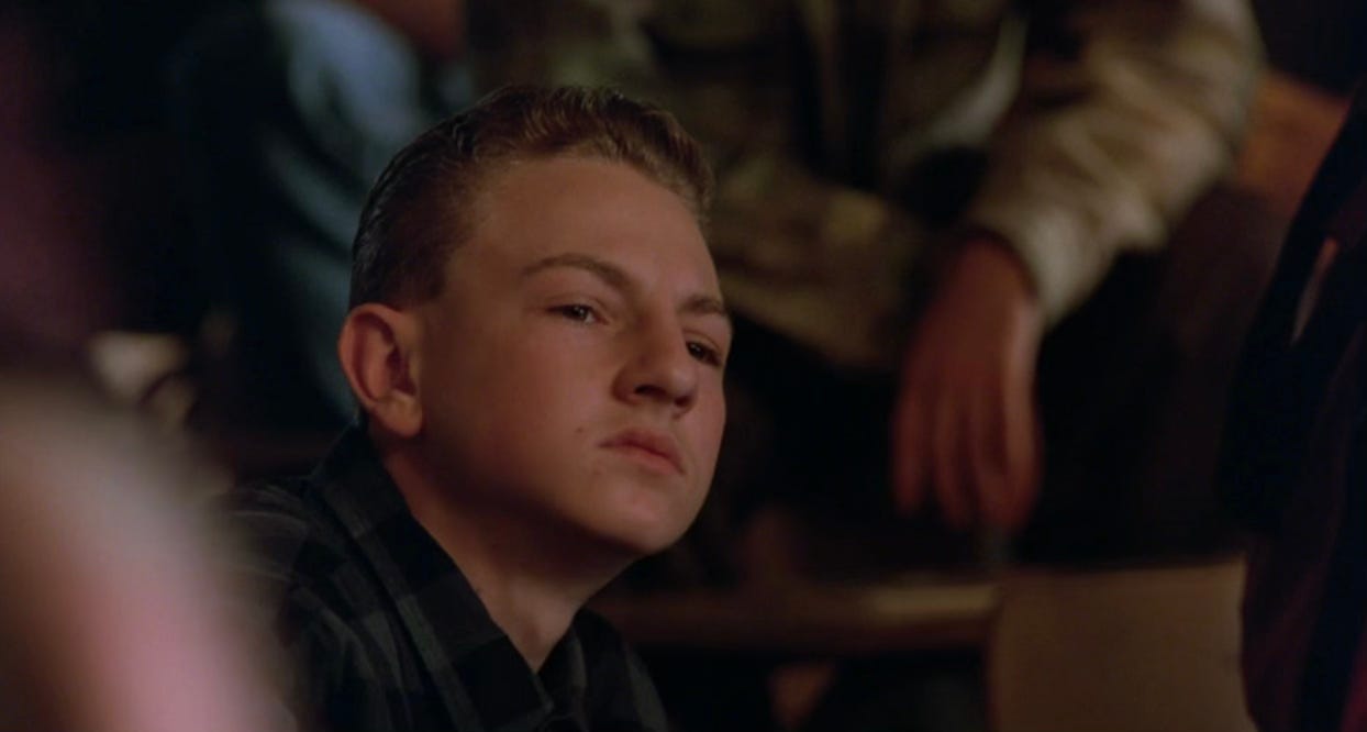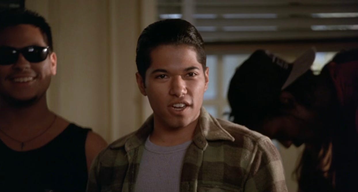 9:26: Renoly Santiago is here. He plays Raul, one of the students Miss Johnson ends up taking a special interest in. I’ve always kept a space in my heart for Renoly, mainly because he had a 22-month stretch in the mid-90s where he just kept popping up in movies that I loved. He did Dangerous Minds in August of 1995 (fuck yes), Hackers in September of 1995 (fuck yes), Daylight in December of 1996 (I did not love this movie, or even like it, really, but I did watch it, and I was happy when he showed up), and Con Air in June of 1997 (fuck yes).