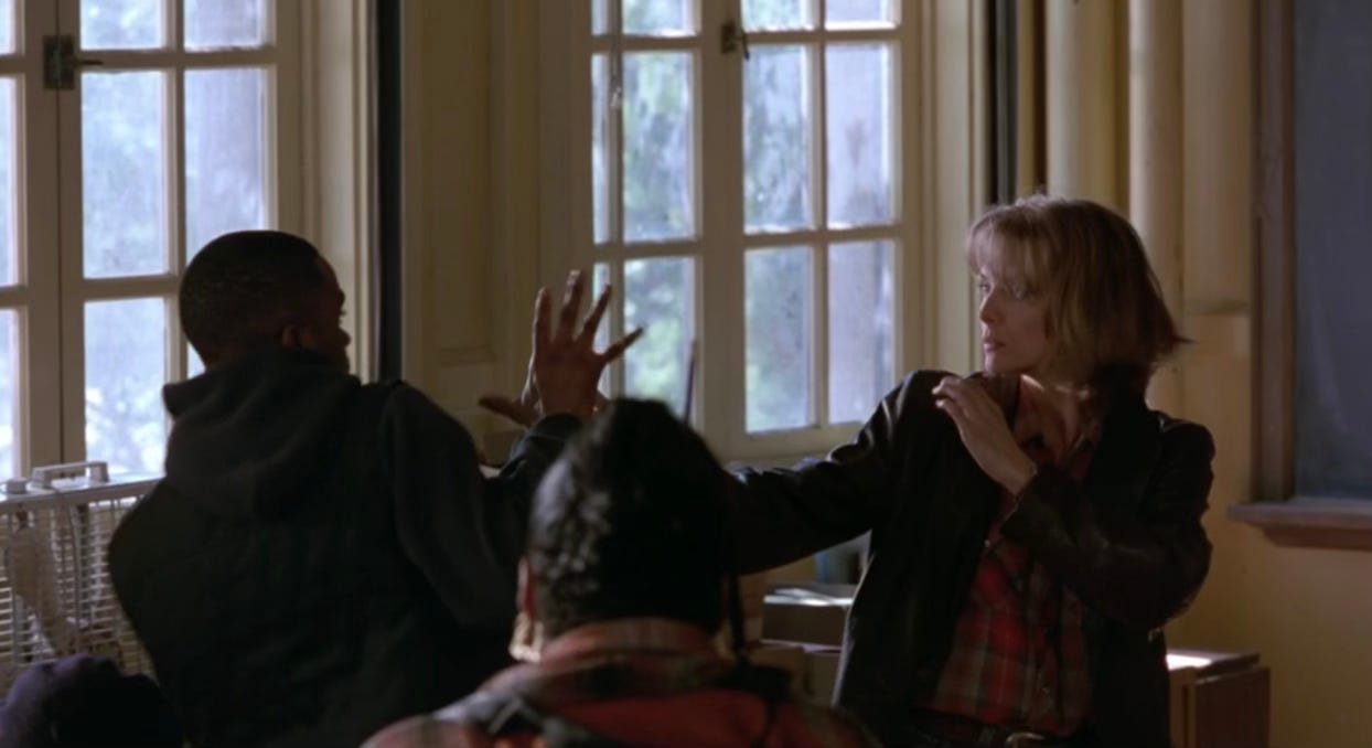 4:04: Michelle Pfeiffer is here. She plays LouAnne Johnson, a former Marine who is transitioning into her new life as a high school English teacher. I’m gonna make a whole bunch of jokes about this movie as we go through it, but it’s important to note: Michelle Pfeiffer, who had already been nominated for three(!!!) acting Oscars by the time she took this role, is legitimately great in it. She feels exactly the right amount of cool, and exactly the right amount of tough, and exactly the right amount of empathetic. She’s an all-time great movie teacher, mingling with Edward James Olmos’s Mr. Escalante from Stand and Deliver, Robin Williams’s Mr. Keating from Dead Poets Society, and Sidney Poitier’s Mr. Thackeray from To Sir, with Love in the top four ever.