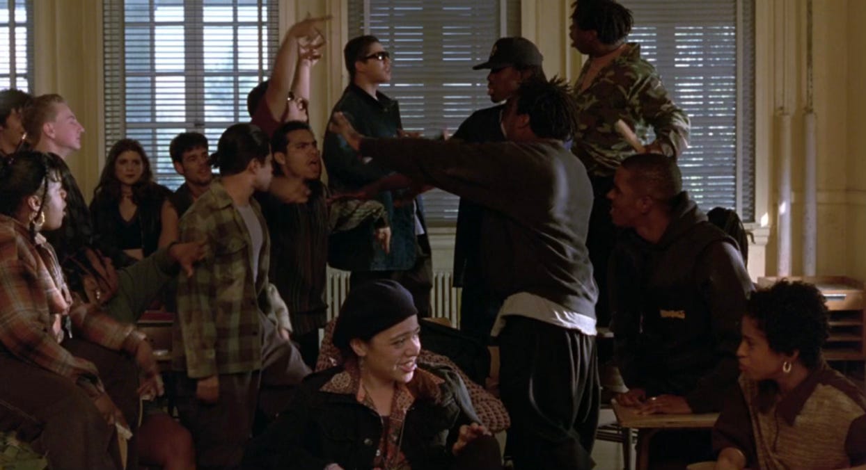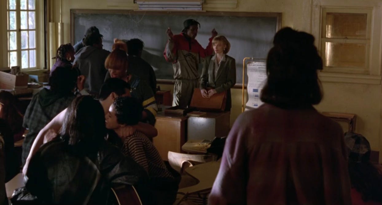 But here’s the thing that makes Dangerous Minds unique—the thing that, despite the movie’s occasional race-related clunkiness, has allowed it to age into one of the genre’s most enduring films: It purports to be one type of movie (namely, a take-me-seriously biopic), but actually it’s a whole different kind. And what I mean is: it takes the primary idea behind the job of being a teacher and bends it into something fantastical. It’s a teacher movie, yes, but it’s a teacher movie the way The Rock is a military movie or Bad Boys II is a cop movie.