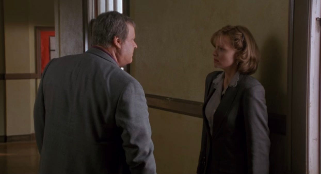11:49: A good teacher nugget happens right here: Miss Johnson is complaining about how there’s no way for her to teach her class, at which point a co-worker and close friend of hers (another teacher on campus—Mr. Griffith, played by George Dzundza), says to her, “Yes, you can. All you gotta do… is get their attention.” My trick when I was teaching was I’d always just set something on fire (I was a science teacher). Setting something on fire has a 100% approval rating among kids.