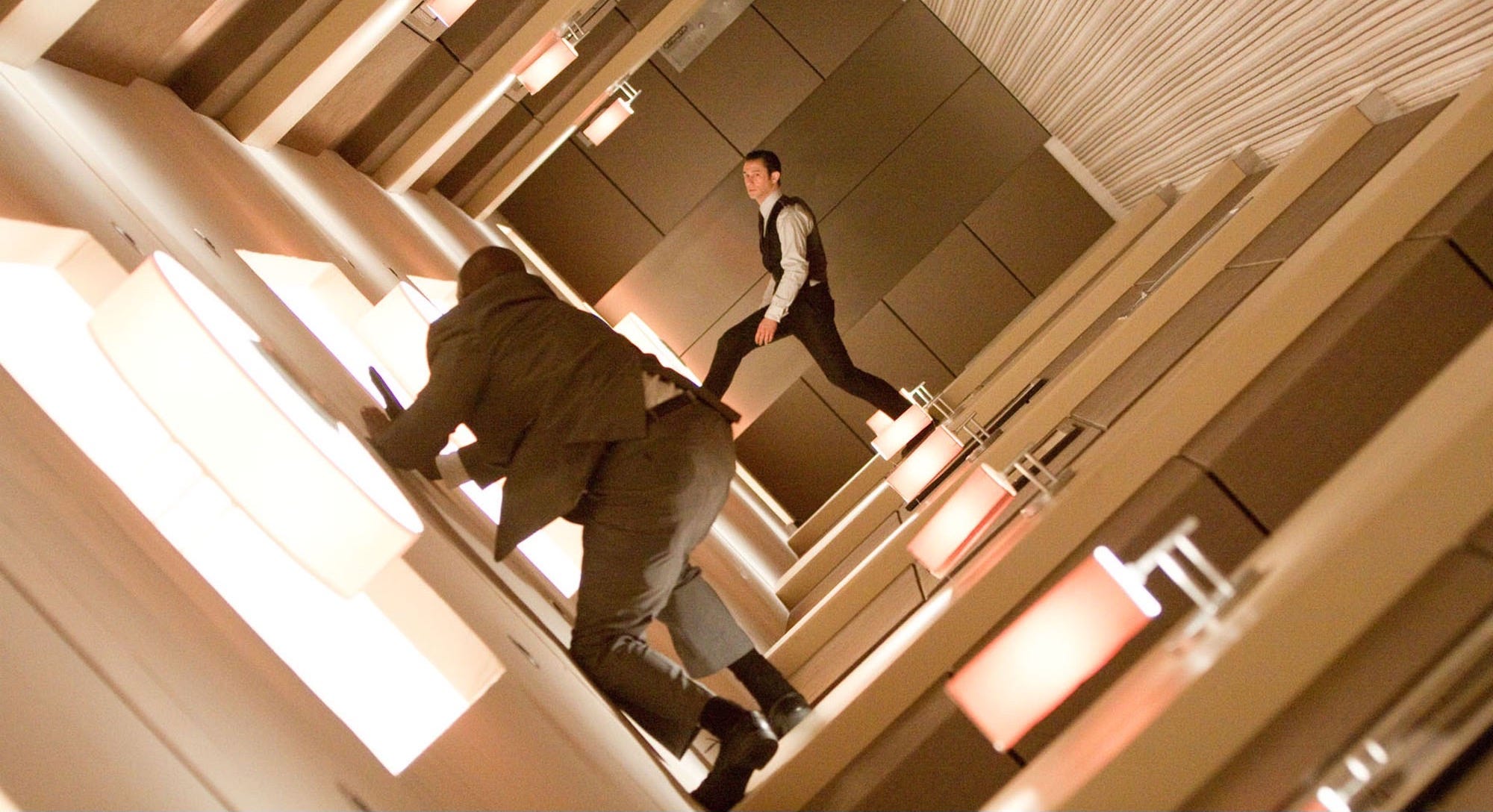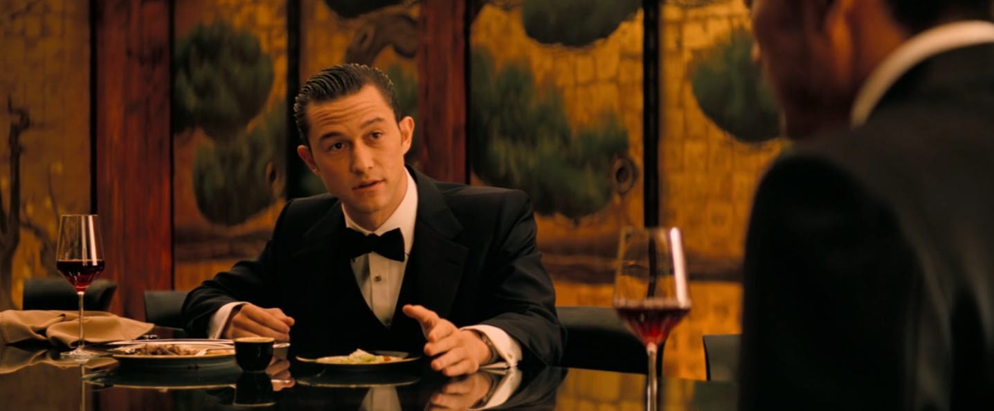 3:19: Joseph Gordon-Levitt is here. He plays Arthur, Dom’s right hand man. Right now, he and Dom are auditioning for a job with a powerful businessman. Their conversation is taking place inside a dream. Except but here’s the thing…