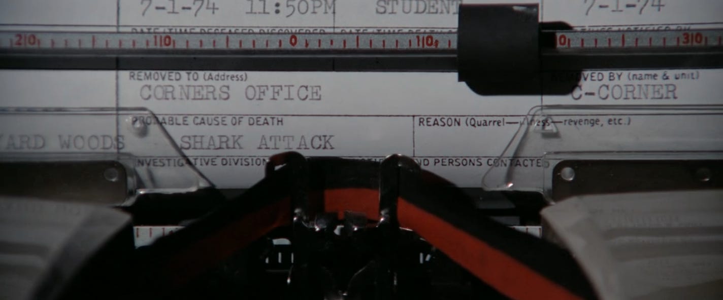 9:38: Two things about this moment here where Chief Brody fills in the PROBABLE CAUSE OF DEATH section on the police report after Chrissie’s remains wash up on the shore: