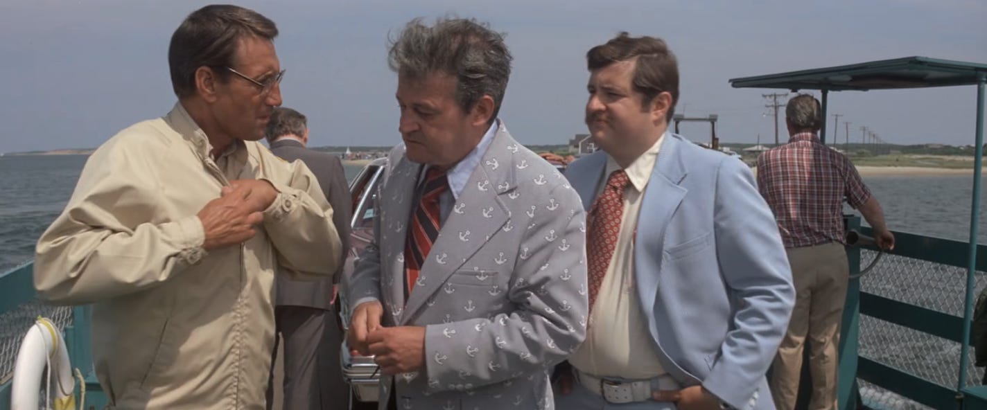 13:08: P.S. In the book version of Jaws, Amity Island is set off the coast of Long Island, and we find out the mafia is pressuring the mayor to keep the beaches open. In the movie, there’s (thankfully) no mafia. Instead, Mayor Vaughn runs his own real estate company, so presumably he’s nervous about a summer-long shutdown tanking his own business holdings. Or something like that. I don’t know. It doesn’t matter. All that matters is you should never trust any man ever who has a suit jacket with anchors embroidered onto it.